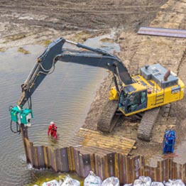 Hydraulic add-on vibrators are mounted to the stick of a hydraulic excavator instead of the bucket and are connected to the hydraulic system for driving and extracting trench sheets, sheet piles, H-piles or steel pipes up to a length of 7 m (depending on the stick configuration)